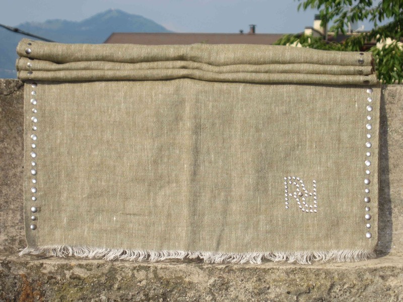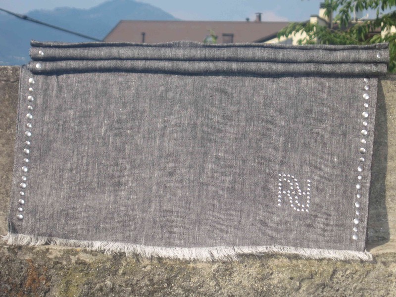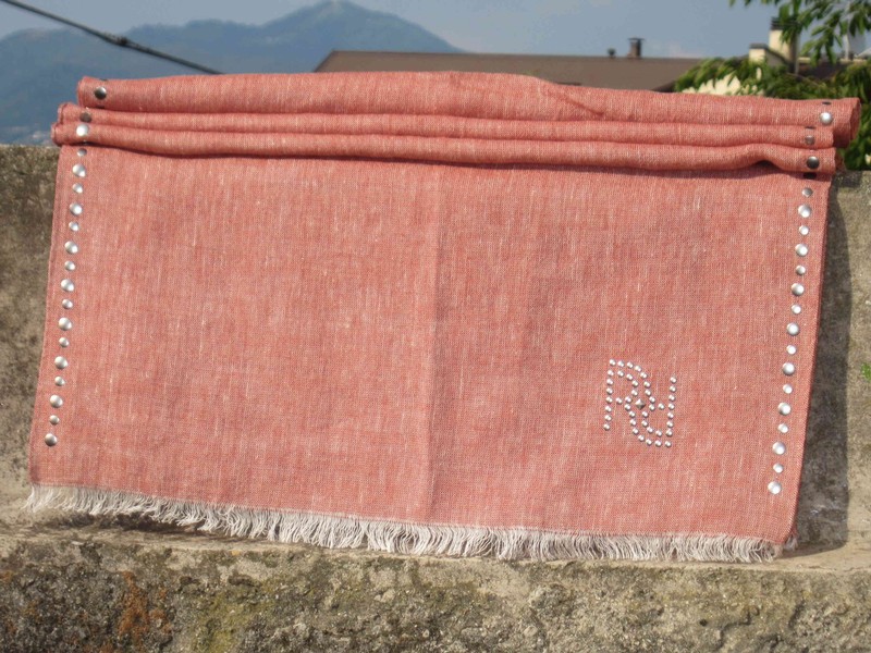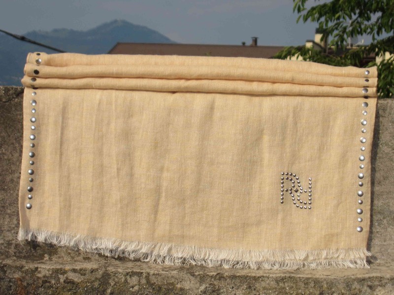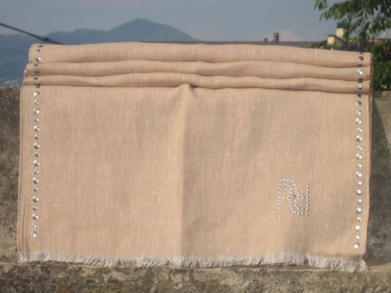 Sciarpa in Lino e Lana di peso medio/leggero, calda, avvolgente con logo borchiato e borchie sui lati.