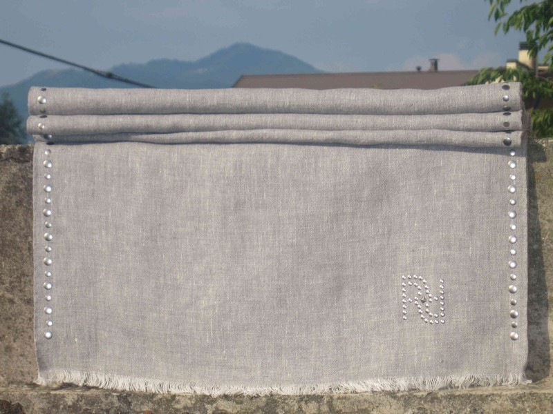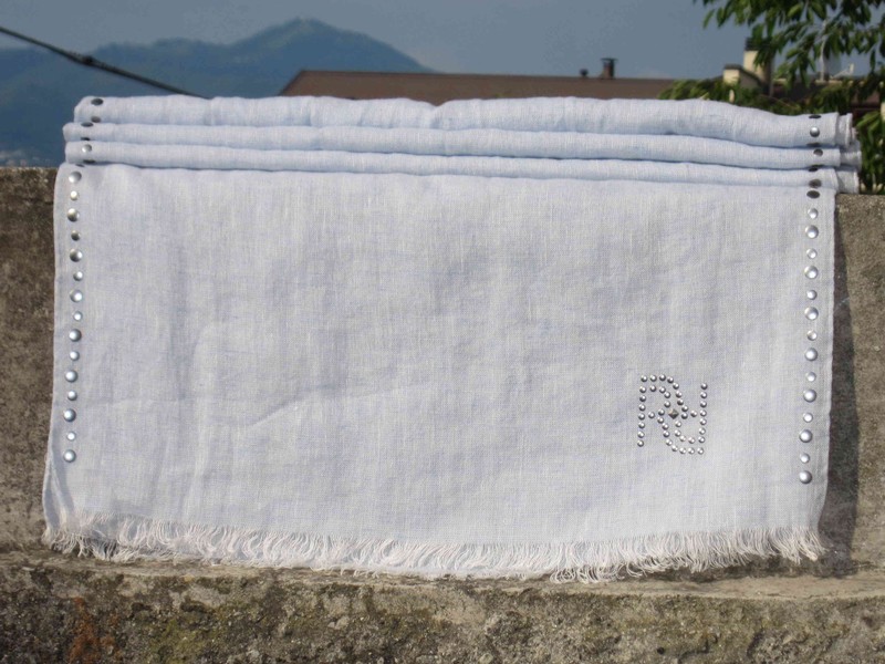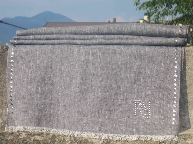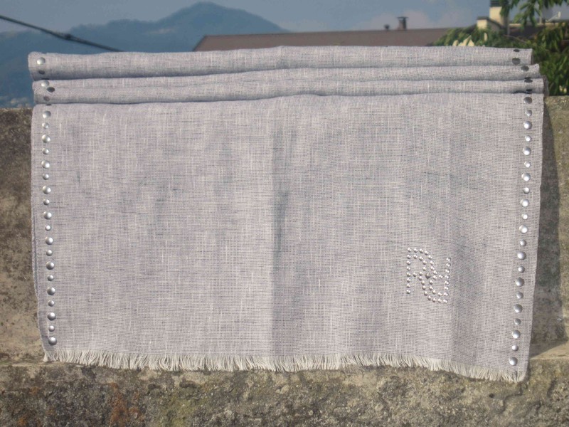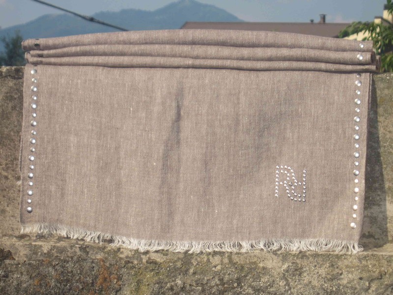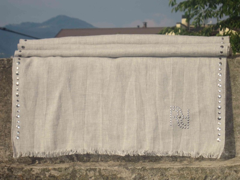 Sciarpa in Lino e Lana di peso medio/leggero, calda, avvolgente con logo borchiato.
